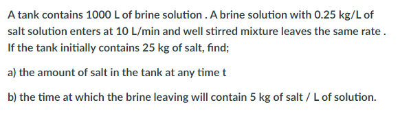 Solved A tank contains 1000 L of brine solution. A brine | Chegg.com