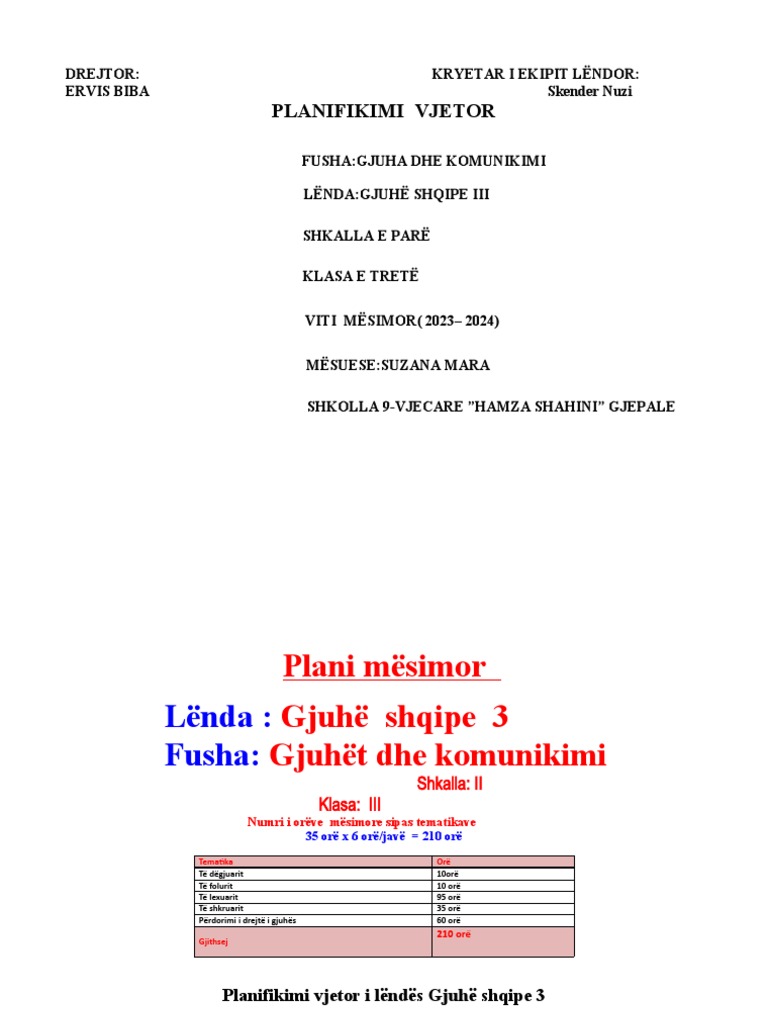 Plani Mesimore Gjuhe Shqipe 3, 2023-2024 | PDF